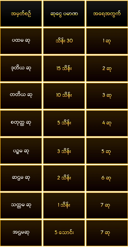 🧧ဆုမဲအေဆာင္ေရအလိုက္ ပထမဆု ၊ ဒုတိယဆု ႏွင့္တတိယ ဆုအစဥ္လိုက္ခြဲေဝမည္ျဖစ္သည္။